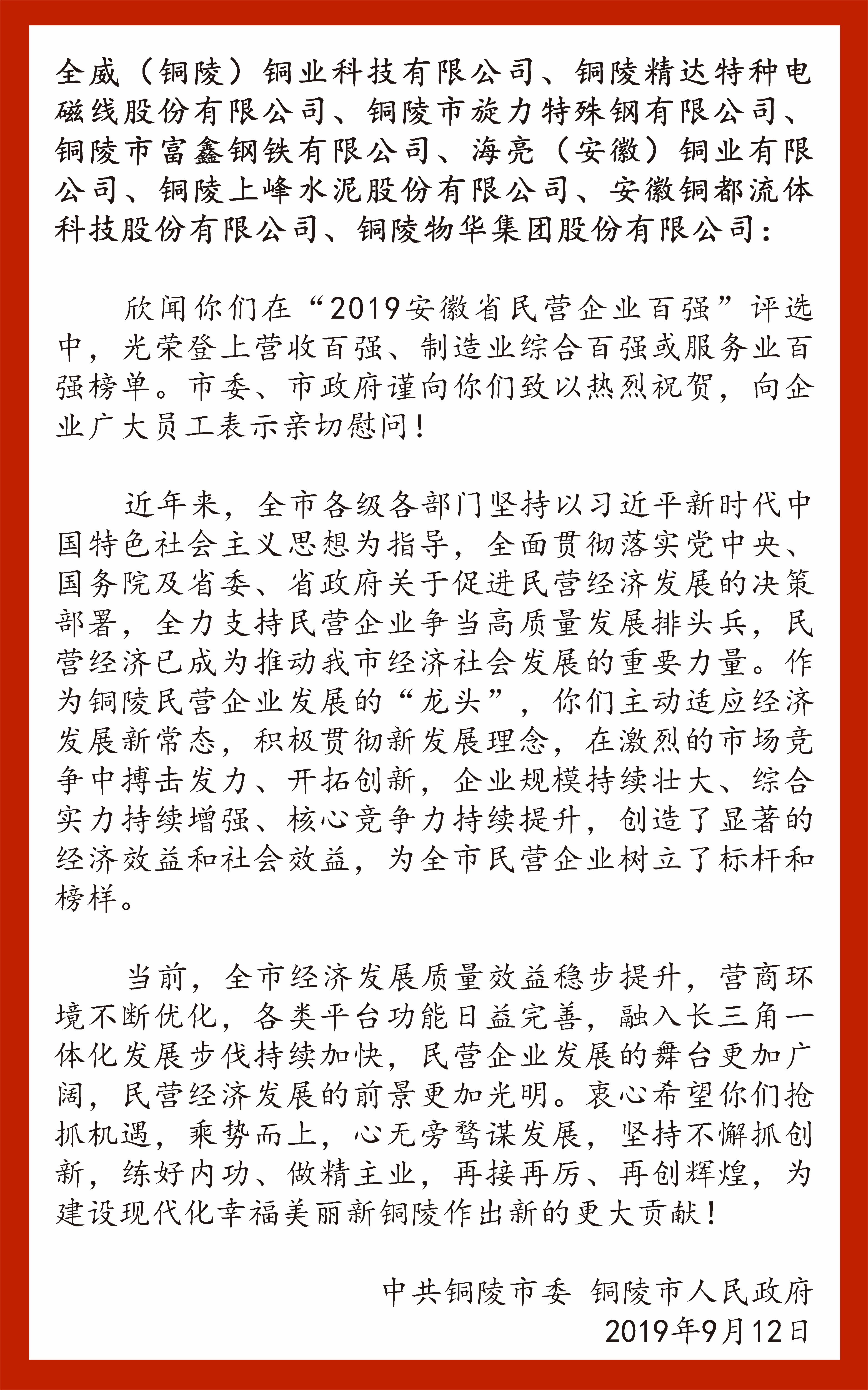 9月12日,在中秋佳節即將來臨之際,中共銅陵市委、銅陵市政府對銅都流體榮登“2019安徽省民營企業百強”榜單致以熱烈祝賀,對企業員工表示親切慰問!