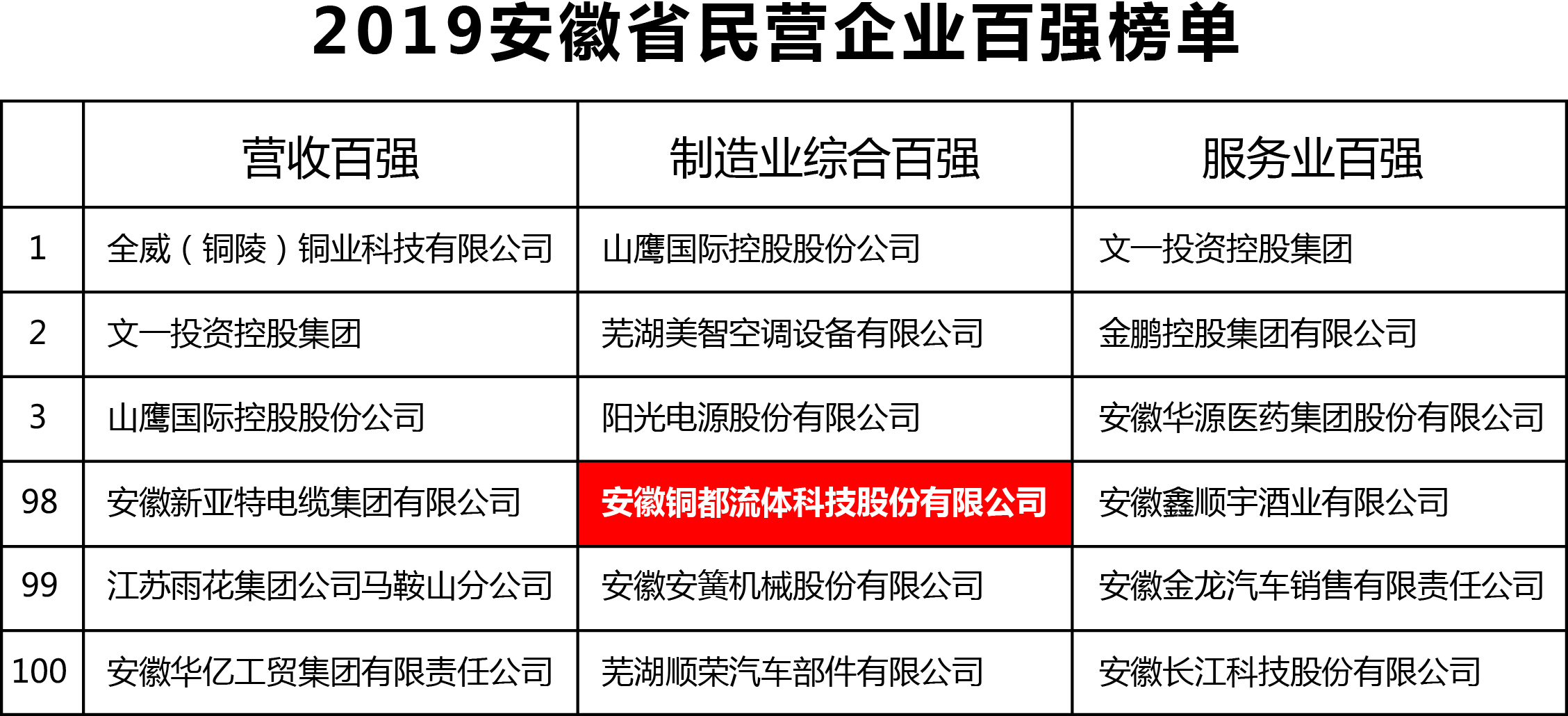 安徽銅都流體科技股份有限公司入圍制造業綜合百強。