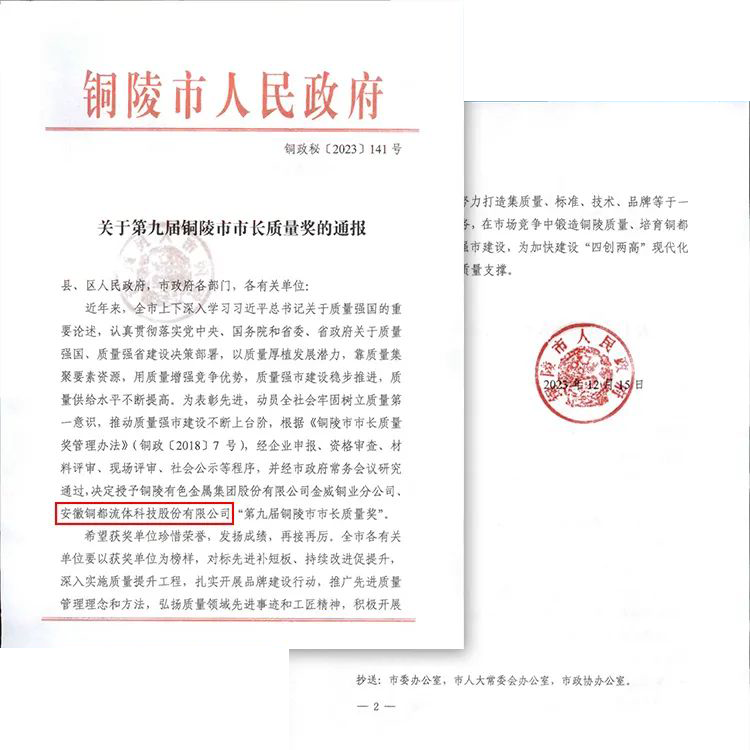 日前,安徽銅都流體科技股份有限公司榮獲第九屆銅陵市市長質量獎。